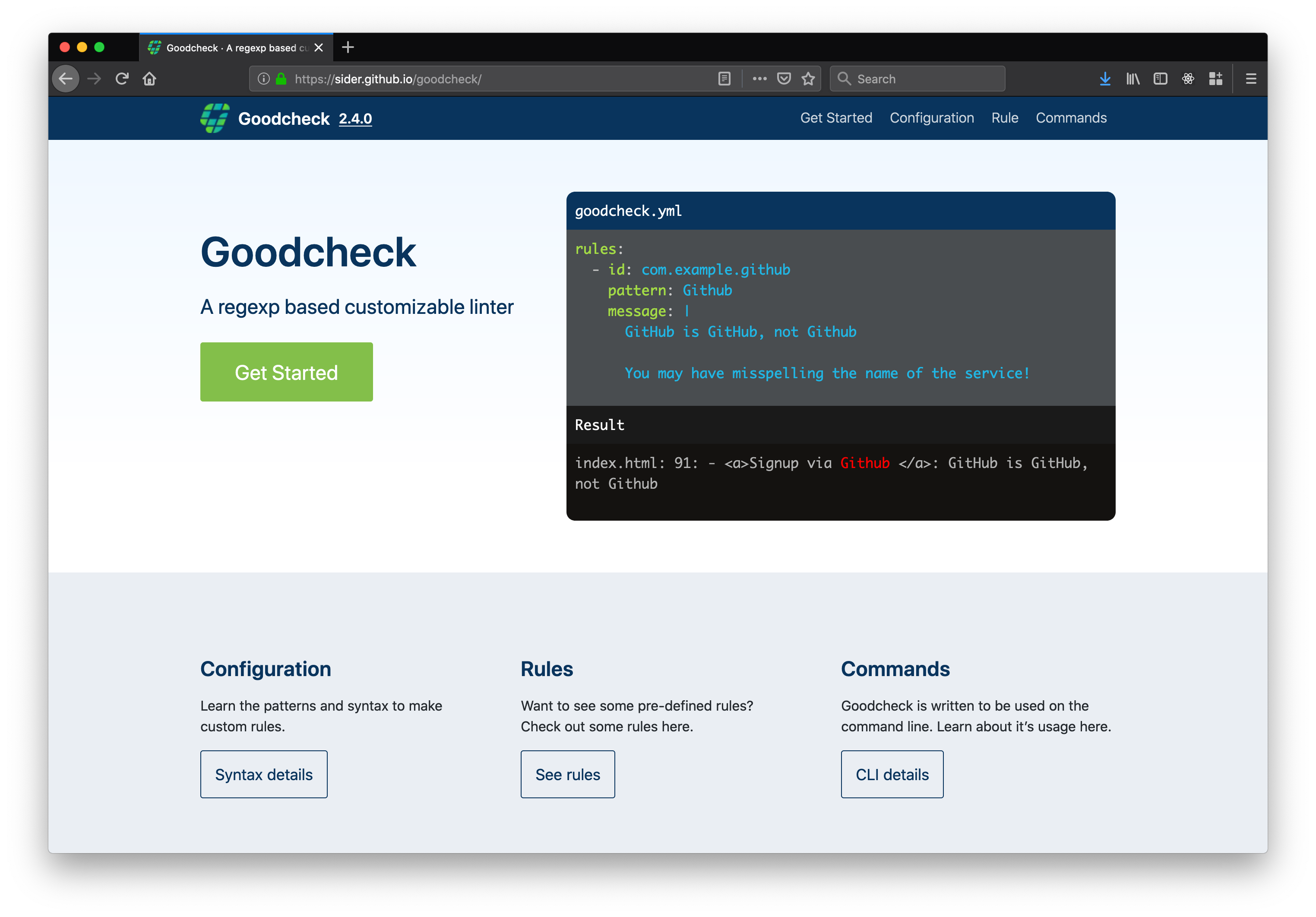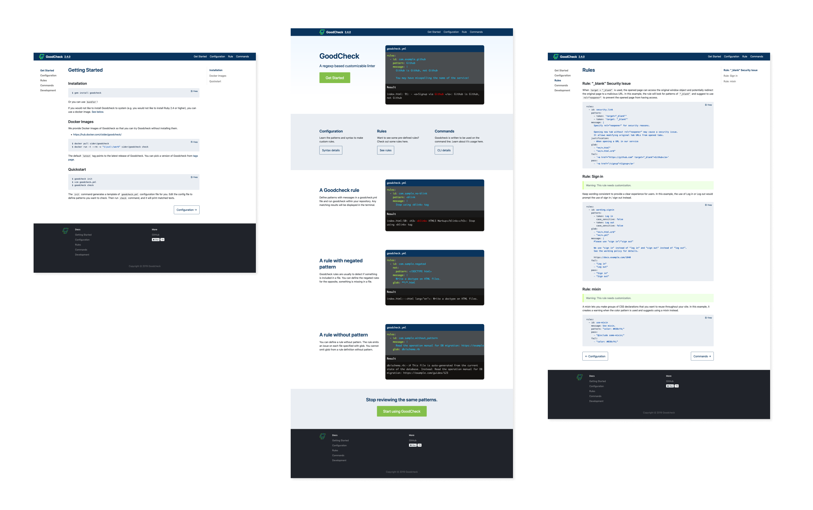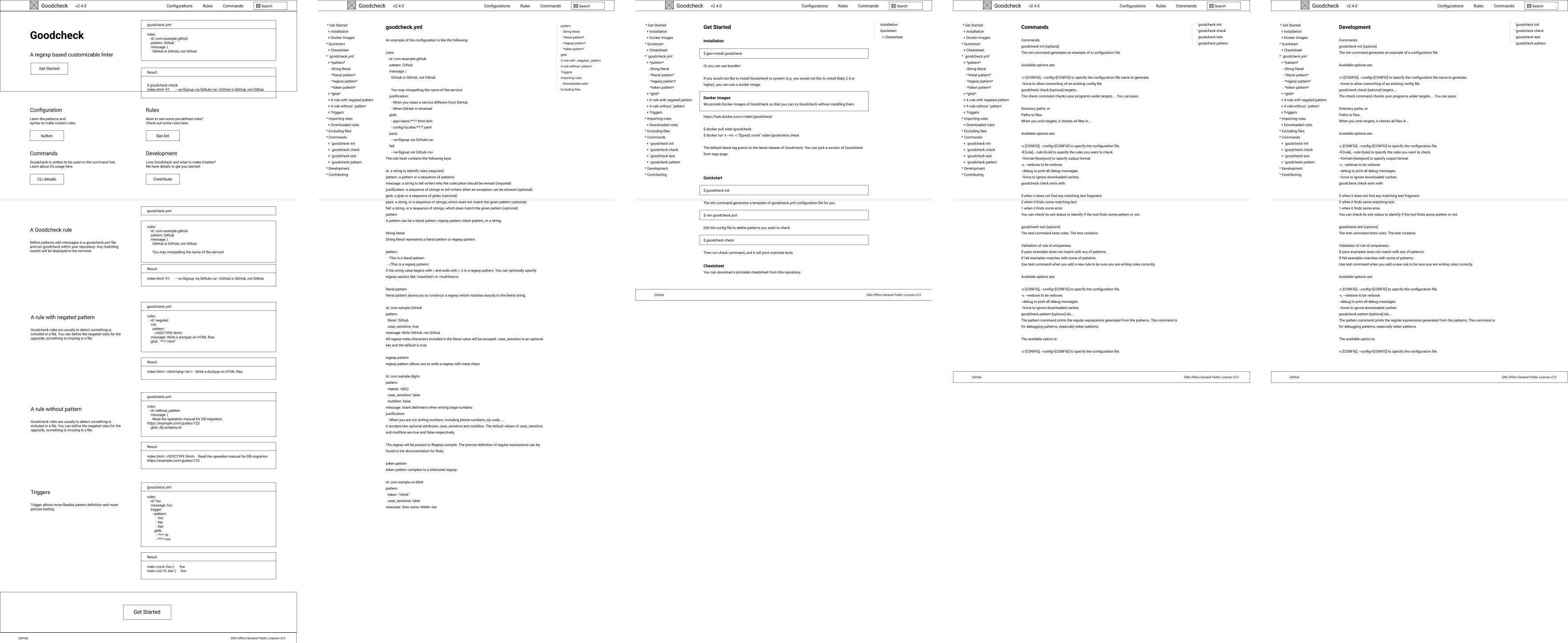 I was asked to create a documentation website that was easy for developers to look through and refer to for information. The website would help developers unfamiliar with Goodcheck get a better understand of it's abilities. I decided to feature code samples and explainations which would appeal to developers.