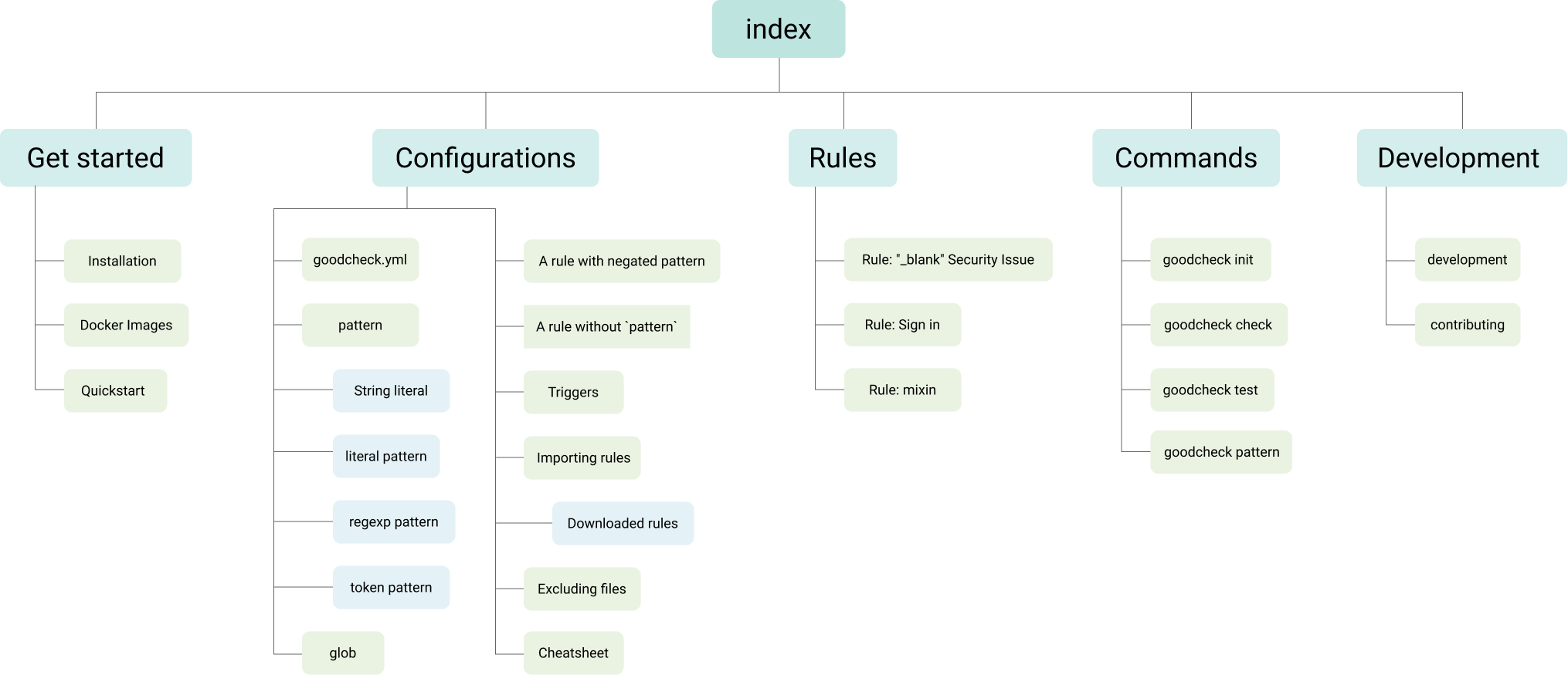 The GitHub repository for Goodcheck already had the information in the read me, but was all on one page making it difficult to sort through. Breaking them down into the various sections would make it easier to access.